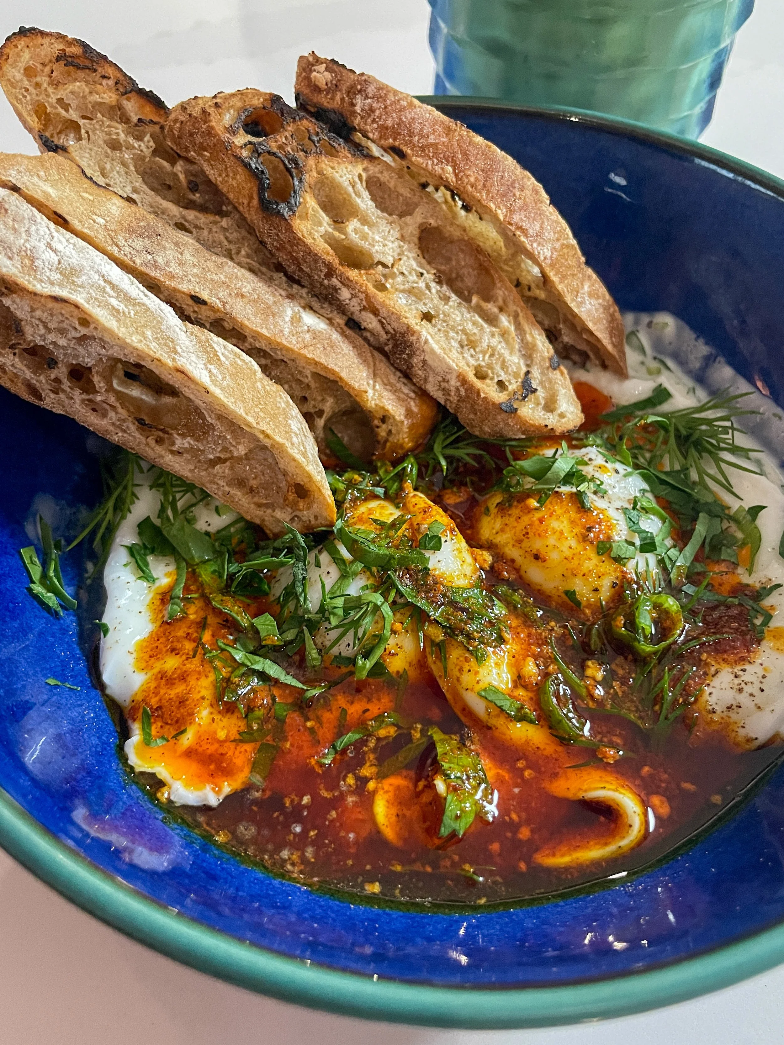 Turkish poached eggs in a bath of spiced butter and herbed yogurt